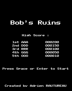 In this old school arcade game, help Bob to get the treasure of the ruins without getting caught by the occular guardian ! Try to find the balance between caution and speed, otherwise you will know a terrible fate !